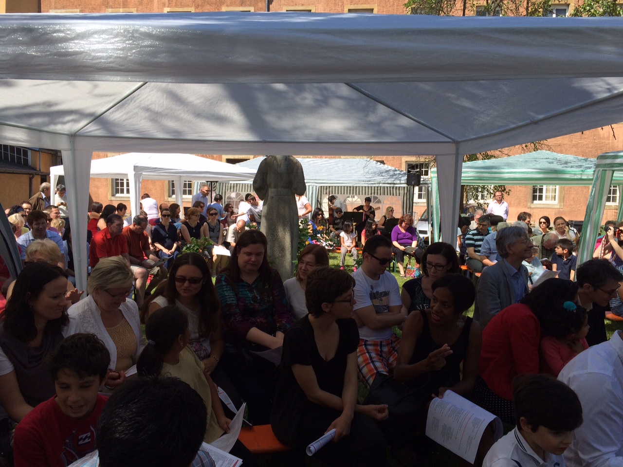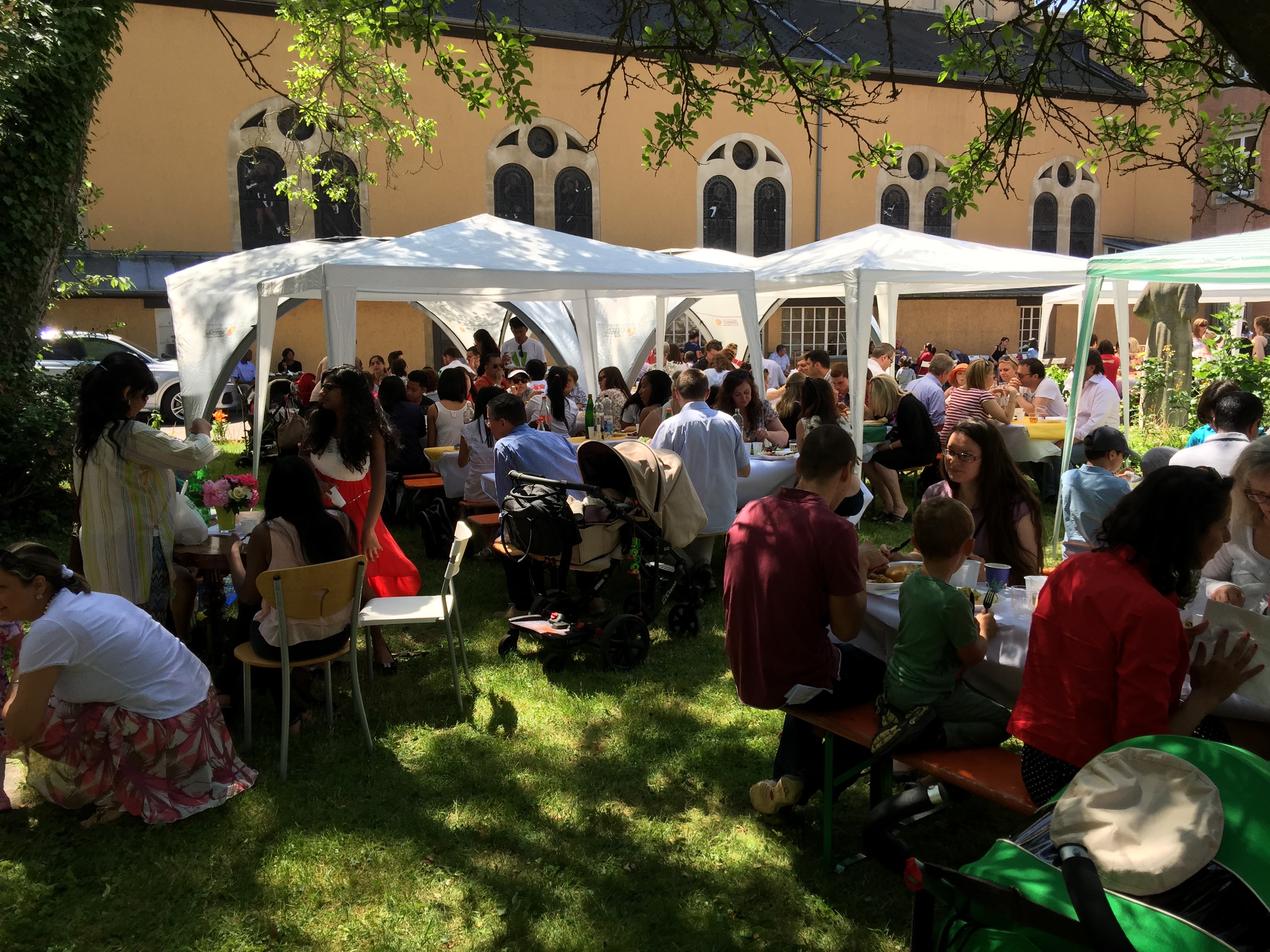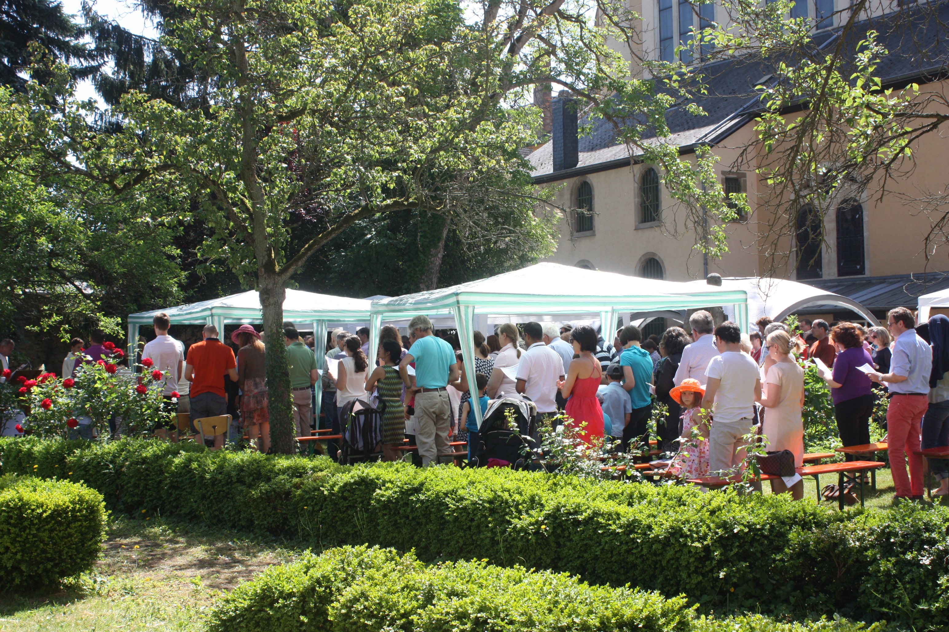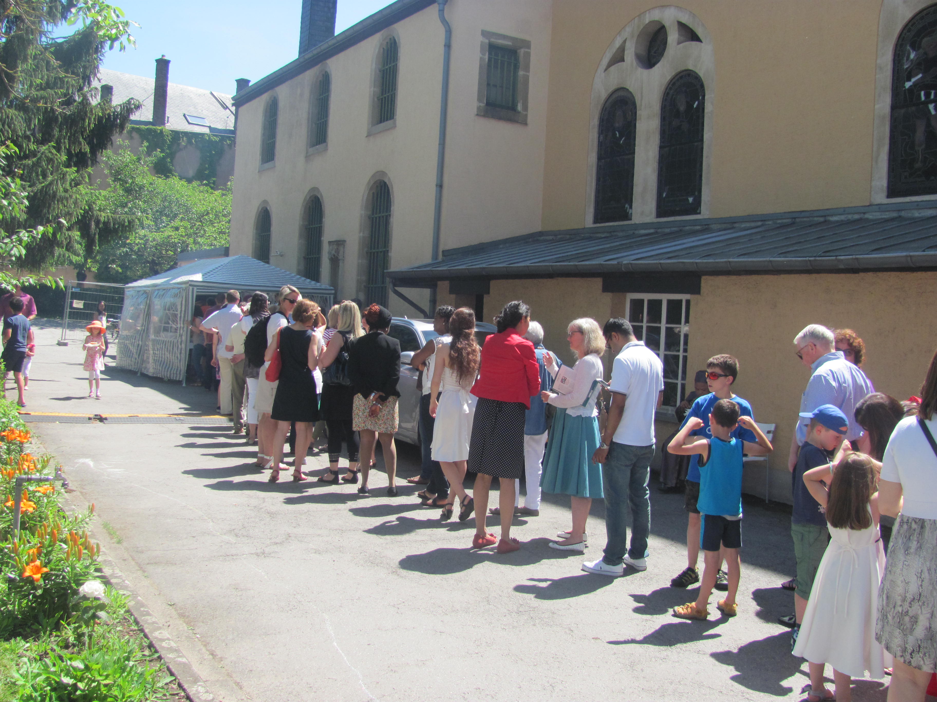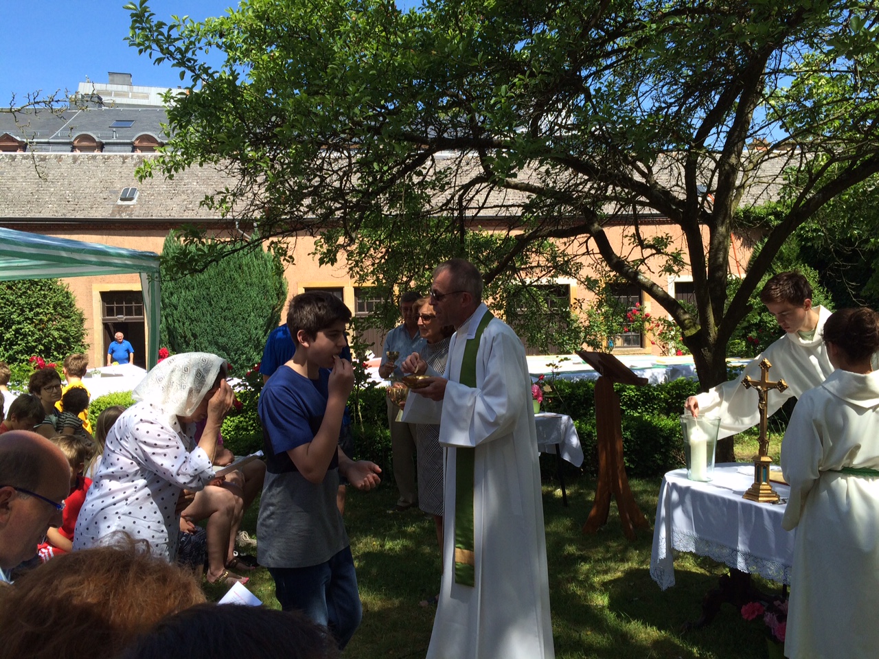 The year before last, we broke with tradition, and instead of having our annual outdoor Mass and picnic at Trintange, we accepted the generous invitation of the archbishop and celebrated in his garden. Last year, we moved to the garden of St Alphonse. Again, we had a great celebration. Like the people of Israel in the Old Testament, and never standing still, this year we increased our ambition: having lost part of the garden of St Alphonse (sold off earlier this year) we decided to use the same venue but to have a BBQ after the Mass. Never was a risk better taken! Two weeks before the Mass, only 12 people were subscribed. In the event, over 300 signed up for the BBQ, and over 400 were served: even more came for the Mass, but couldn’t stay for the feast afterwards. This doubled our 2014 record; more importantly, we had a wonderful joyful and reverent celebration of Mass: the music group were on great form, and we suspect (and secretly hope) that the singing at Mass woke up many of our neighbours. Nine altar servers, two readers and four ministers of the Eucharist augmented the team, and many of the First Holy Communion group made their Second Holy Communion (as one of them observed to me).