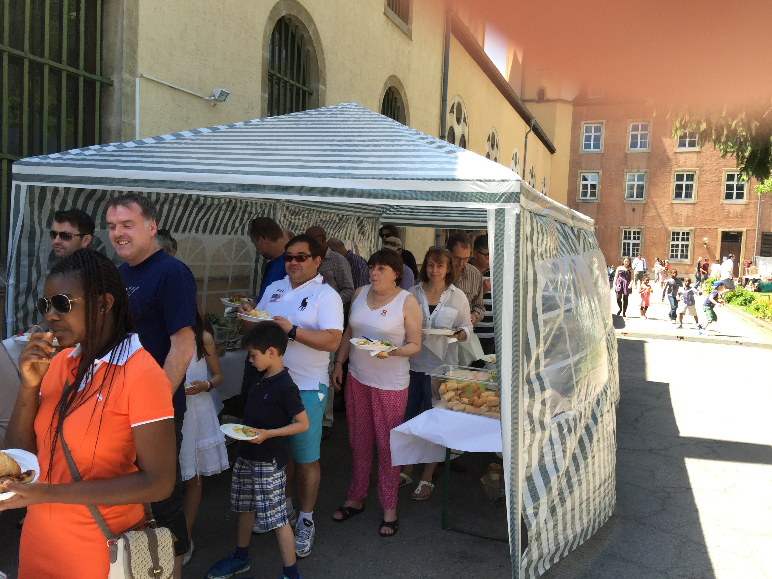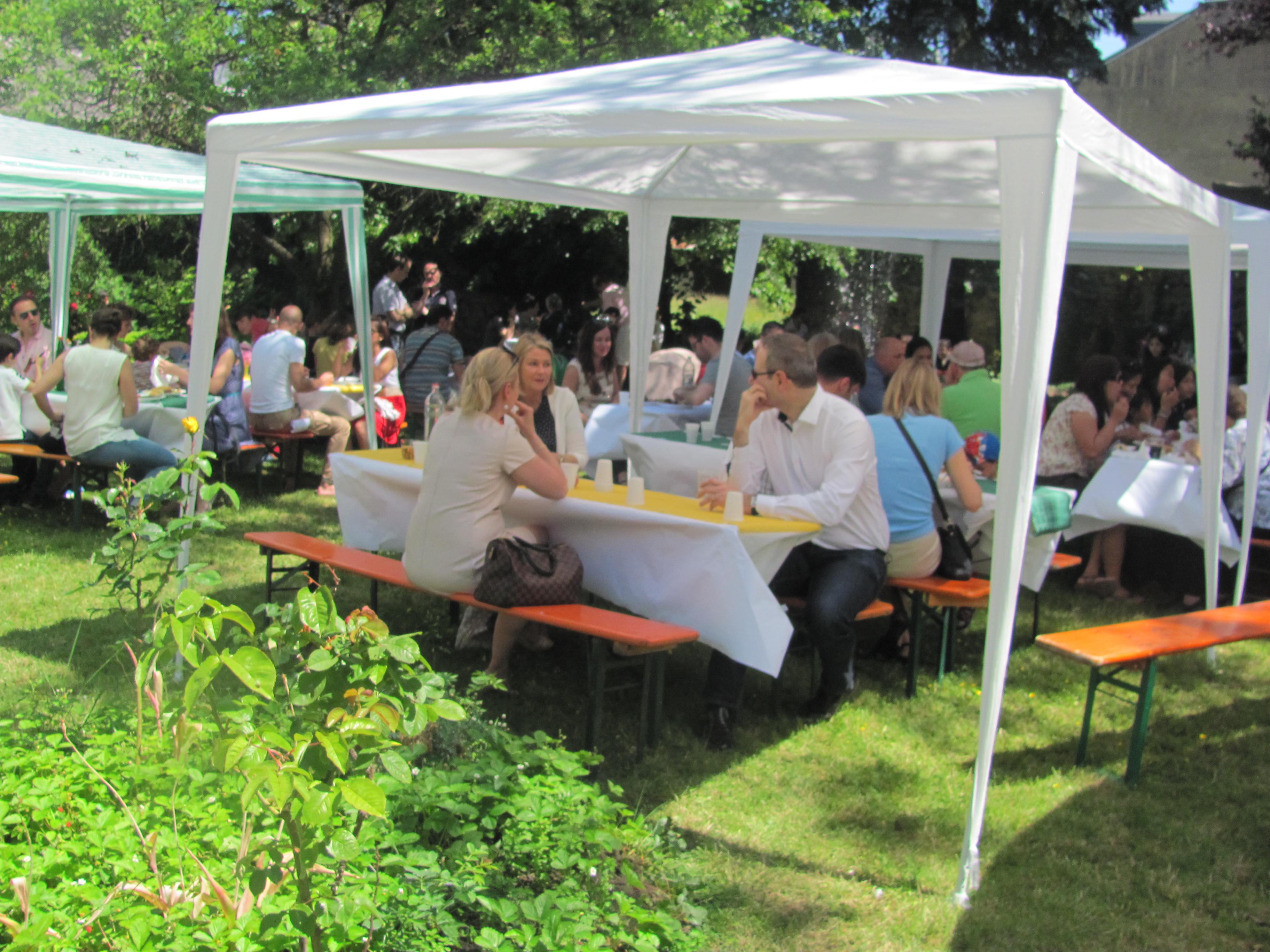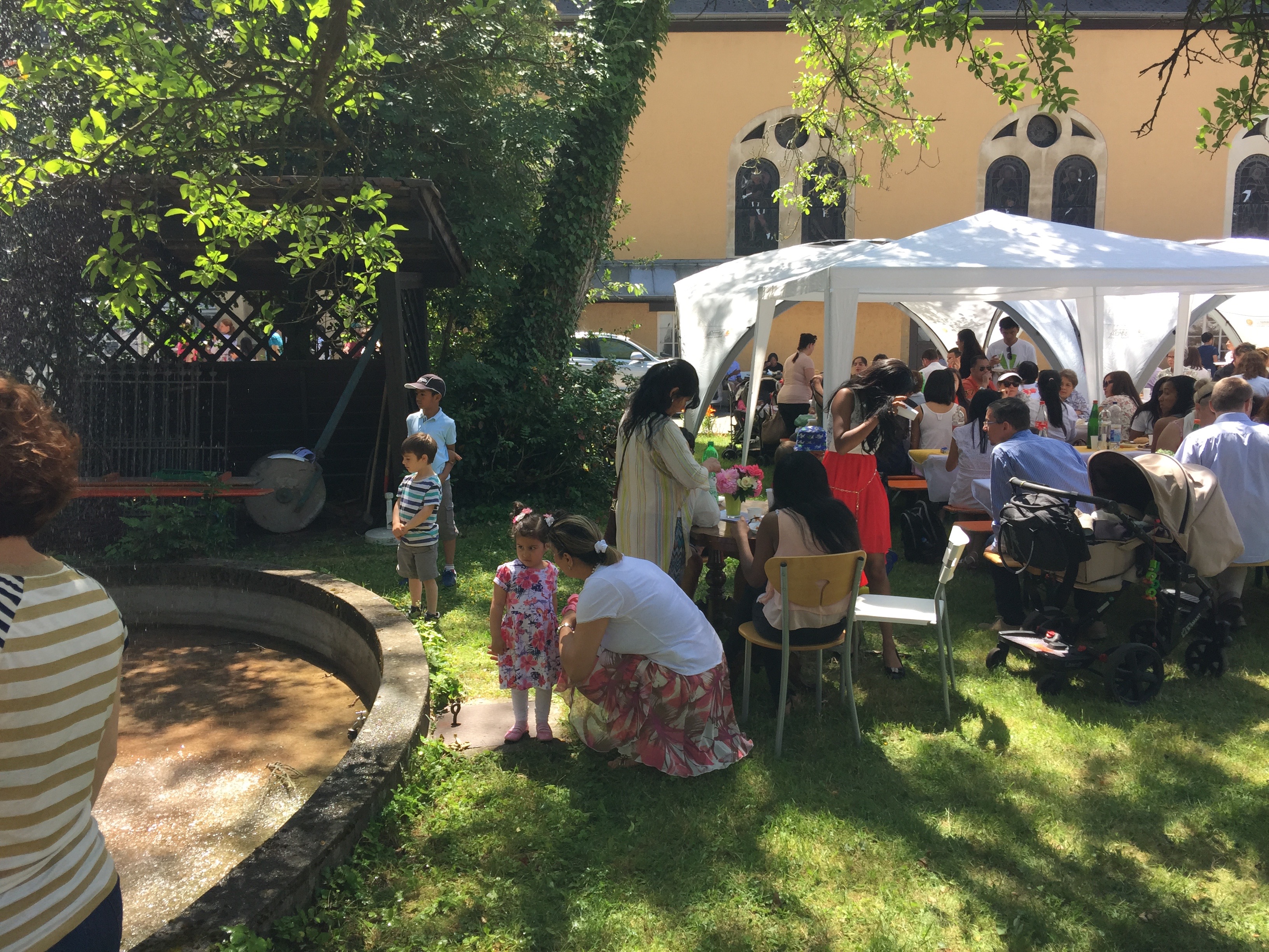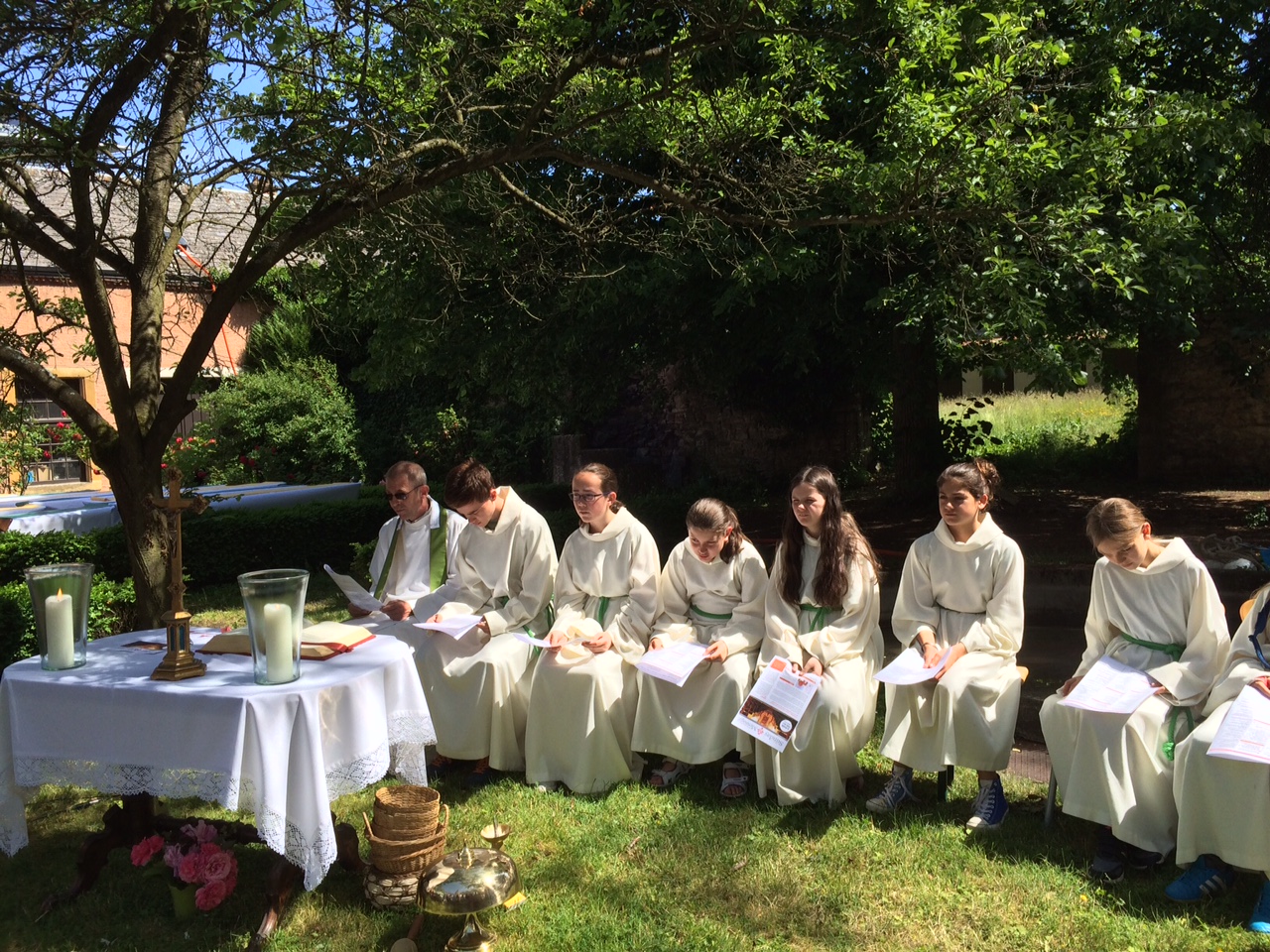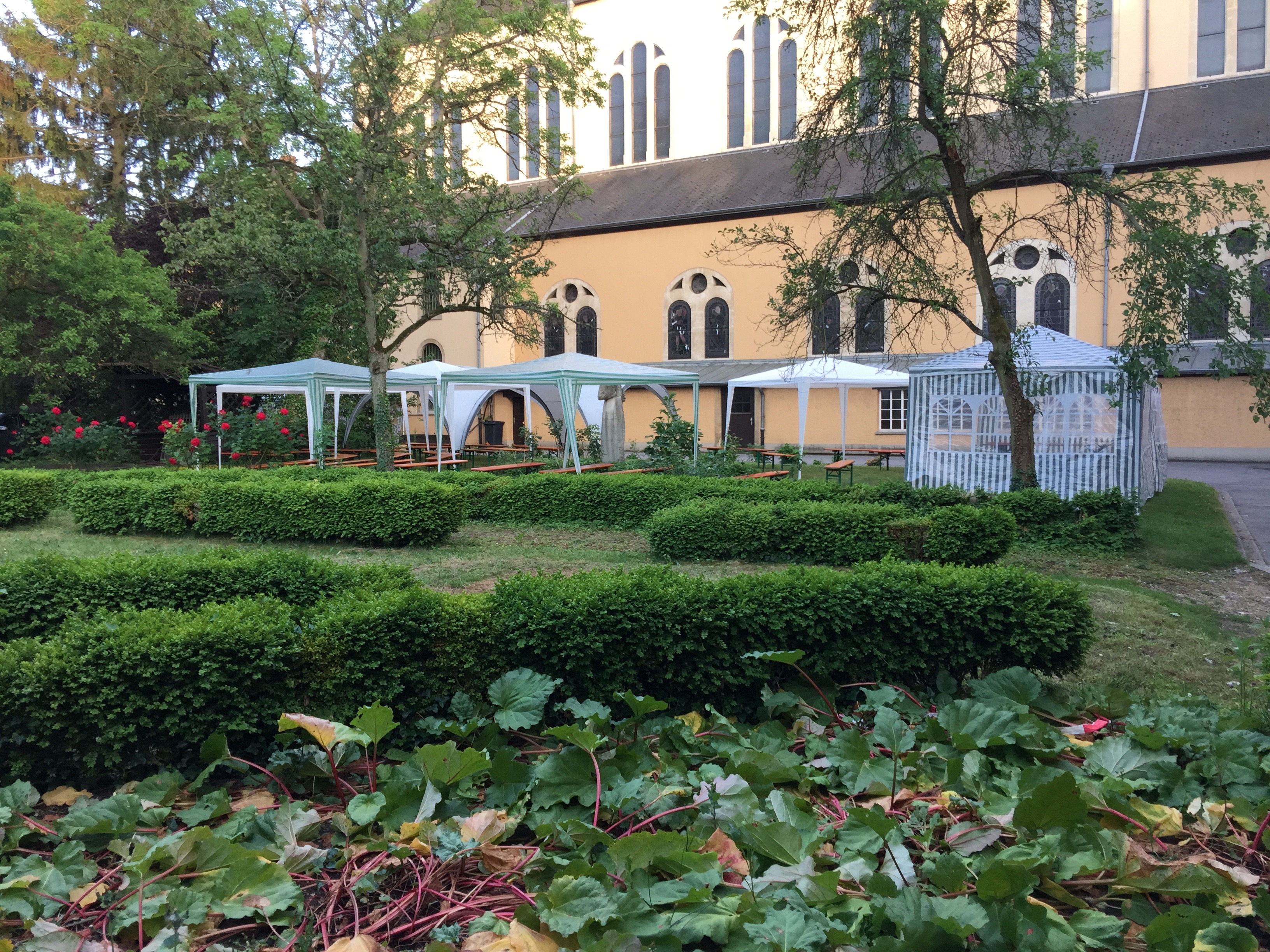 The year before last, we broke with tradition, and instead of having our annual outdoor Mass and picnic at Trintange, we accepted the generous invitation of the archbishop and celebrated in his garden. Last year, we moved to the garden of St Alphonse. Again, we had a great celebration. Like the people of Israel in the Old Testament, and never standing still, this year we increased our ambition: having lost part of the garden of St Alphonse (sold off earlier this year) we decided to use the same venue but to have a BBQ after the Mass. Never was a risk better taken! Two weeks before the Mass, only 12 people were subscribed. In the event, over 300 signed up for the BBQ, and over 400 were served: even more came for the Mass, but couldn’t stay for the feast afterwards. This doubled our 2014 record; more importantly, we had a wonderful joyful and reverent celebration of Mass: the music group were on great form, and we suspect (and secretly hope) that the singing at Mass woke up many of our neighbours. Nine altar servers, two readers and four ministers of the Eucharist augmented the team, and many of the First Holy Communion group made their Second Holy Communion (as one of them observed to me).