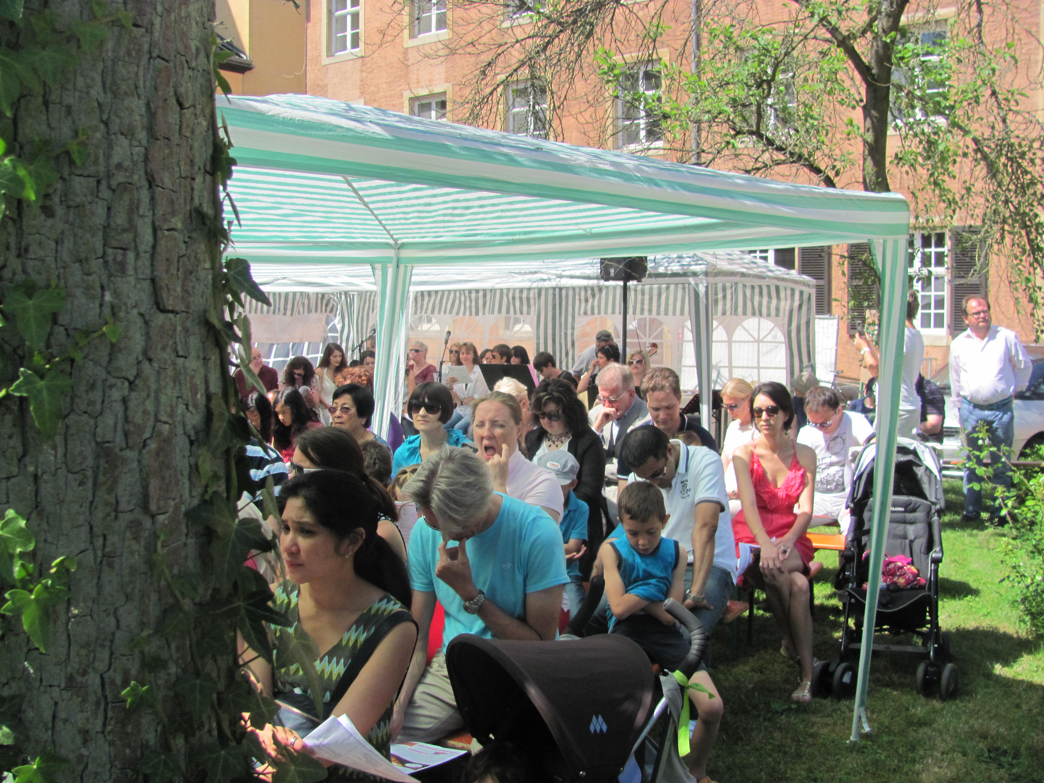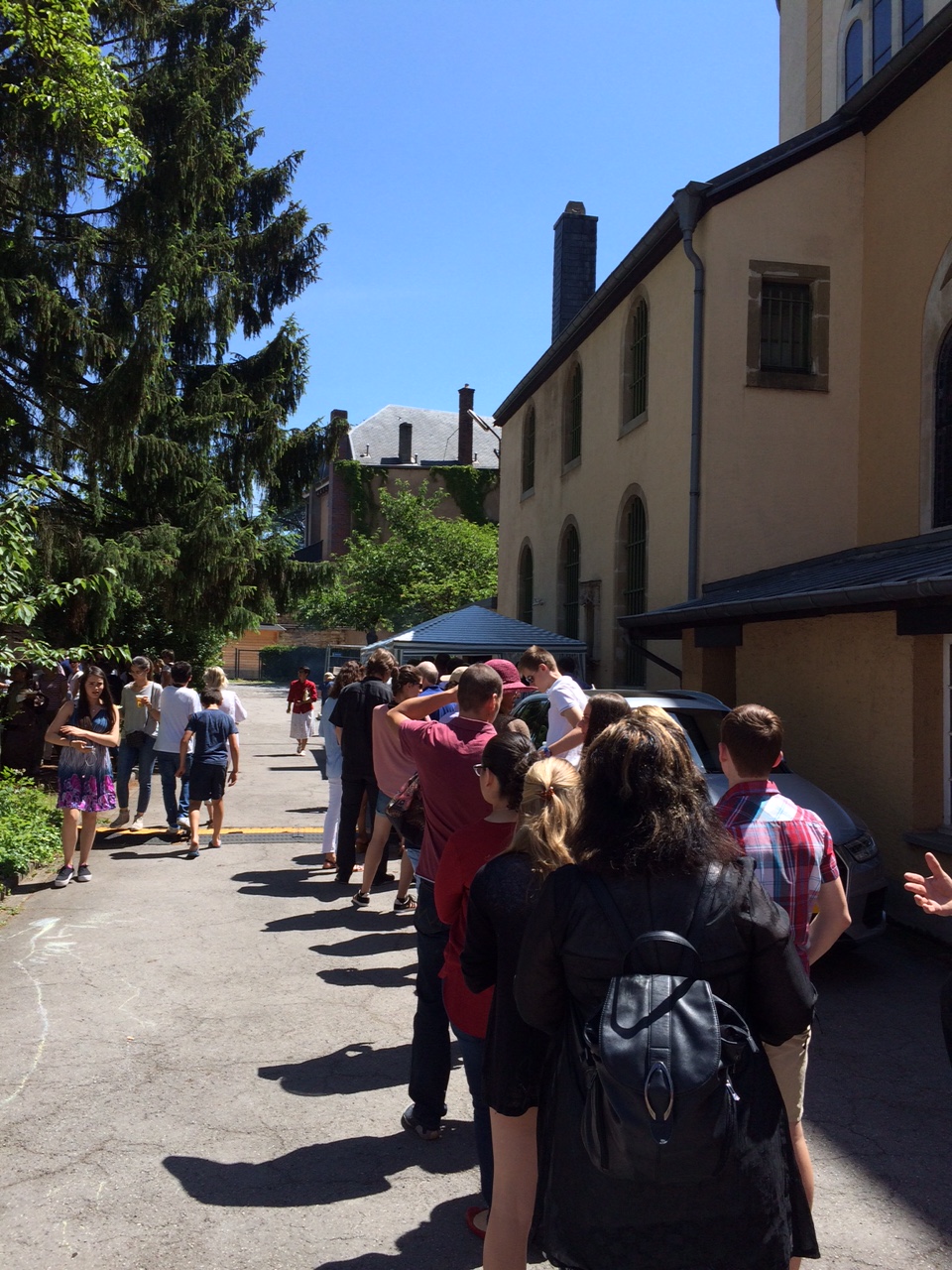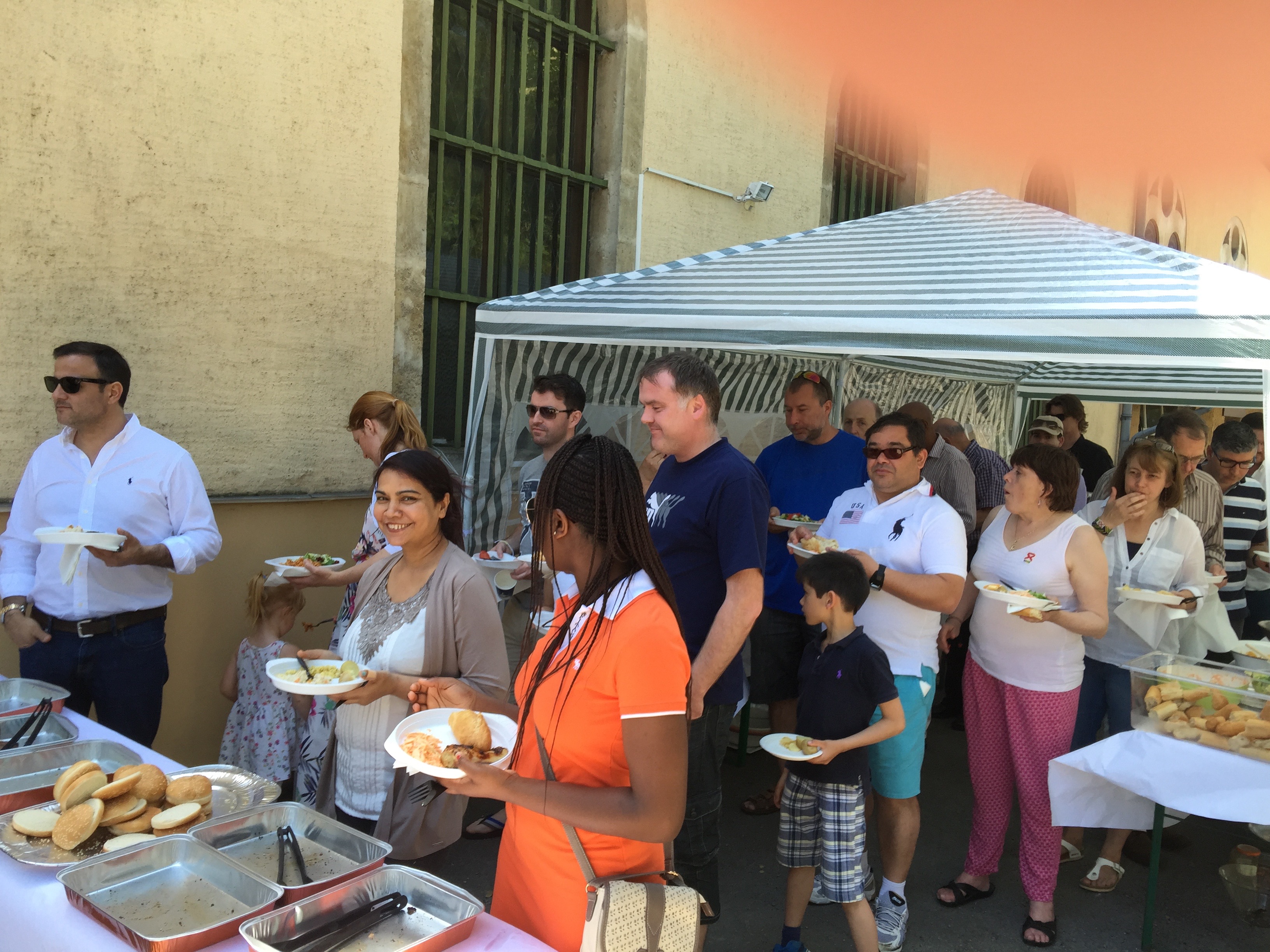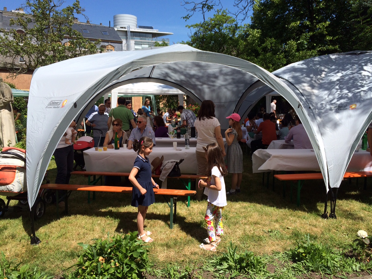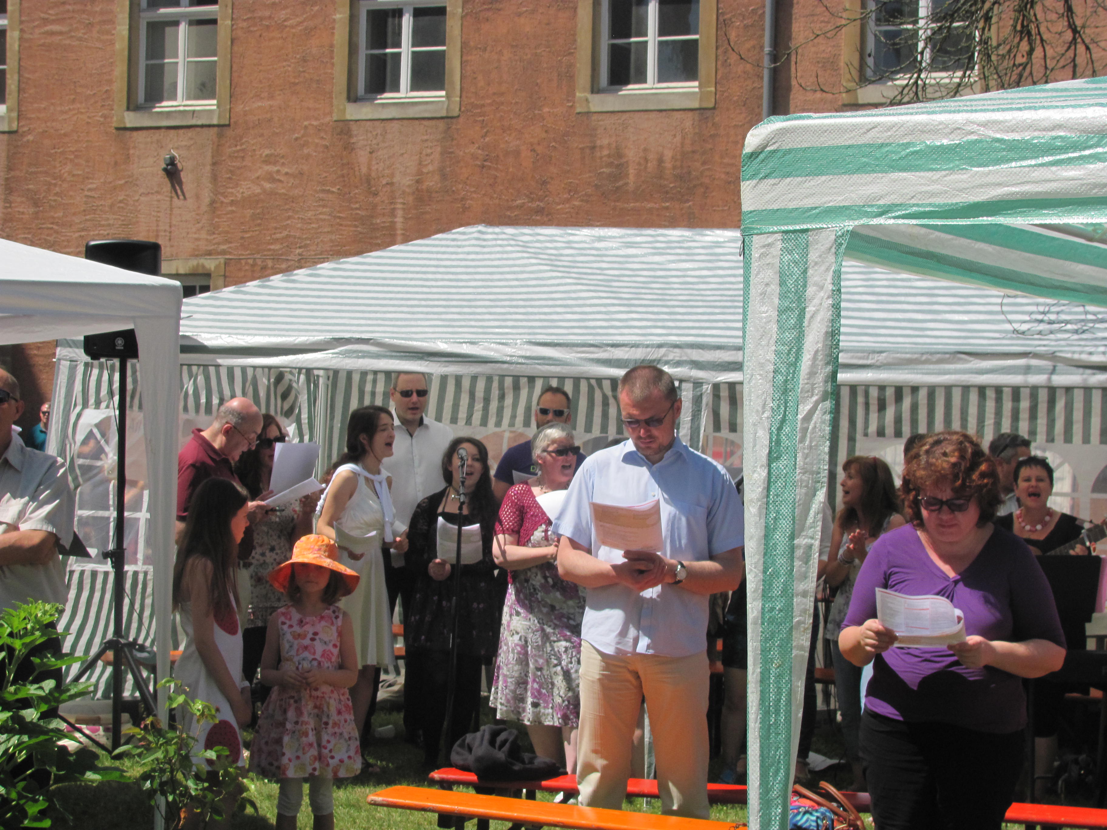 The year before last, we broke with tradition, and instead of having our annual outdoor Mass and picnic at Trintange, we accepted the generous invitation of the archbishop and celebrated in his garden. Last year, we moved to the garden of St Alphonse. Again, we had a great celebration. Like the people of Israel in the Old Testament, and never standing still, this year we increased our ambition: having lost part of the garden of St Alphonse (sold off earlier this year) we decided to use the same venue but to have a BBQ after the Mass. Never was a risk better taken! Two weeks before the Mass, only 12 people were subscribed. In the event, over 300 signed up for the BBQ, and over 400 were served: even more came for the Mass, but couldn’t stay for the feast afterwards. This doubled our 2014 record; more importantly, we had a wonderful joyful and reverent celebration of Mass: the music group were on great form, and we suspect (and secretly hope) that the singing at Mass woke up many of our neighbours. Nine altar servers, two readers and four ministers of the Eucharist augmented the team, and many of the First Holy Communion group made their Second Holy Communion (as one of them observed to me).