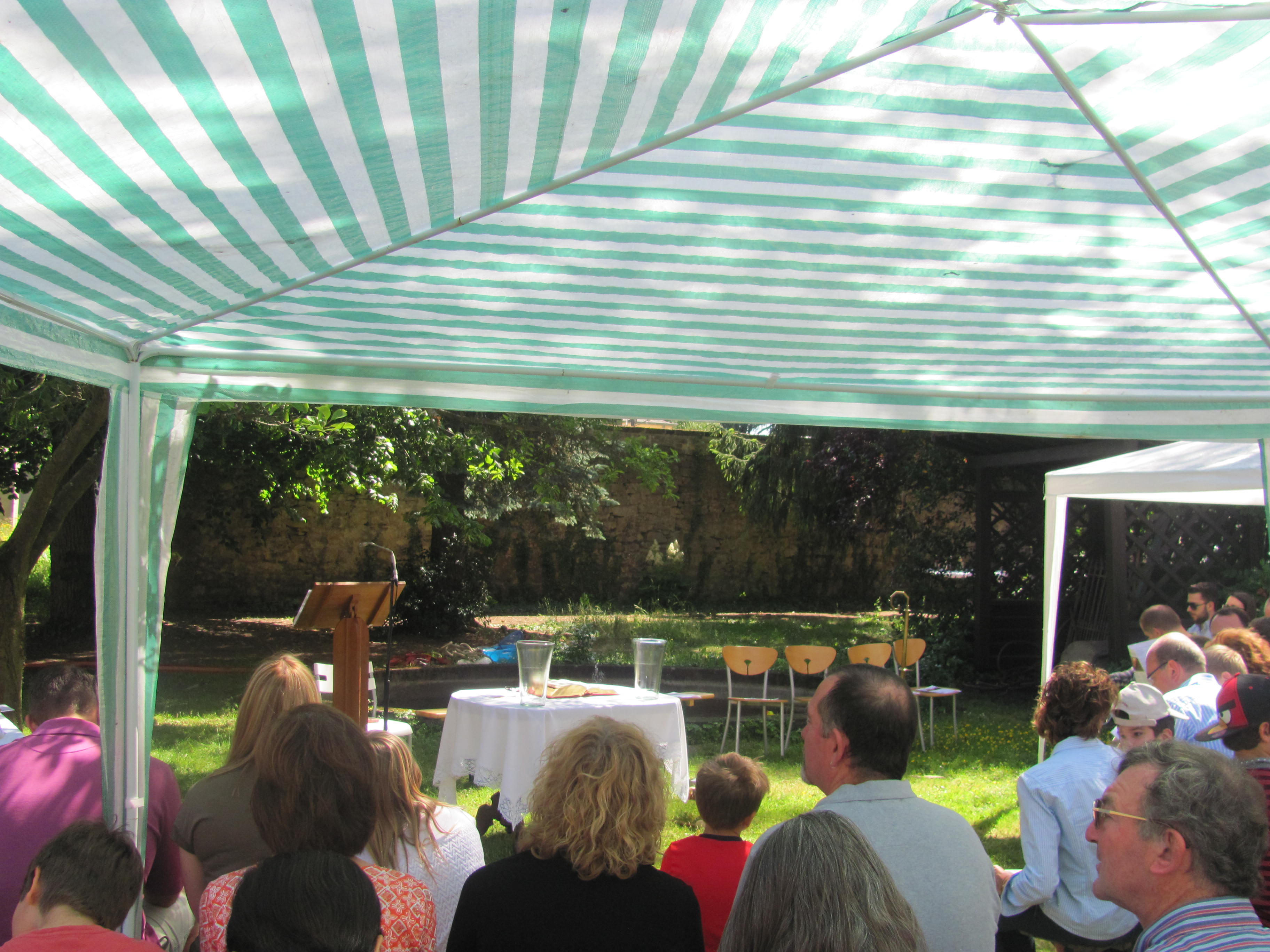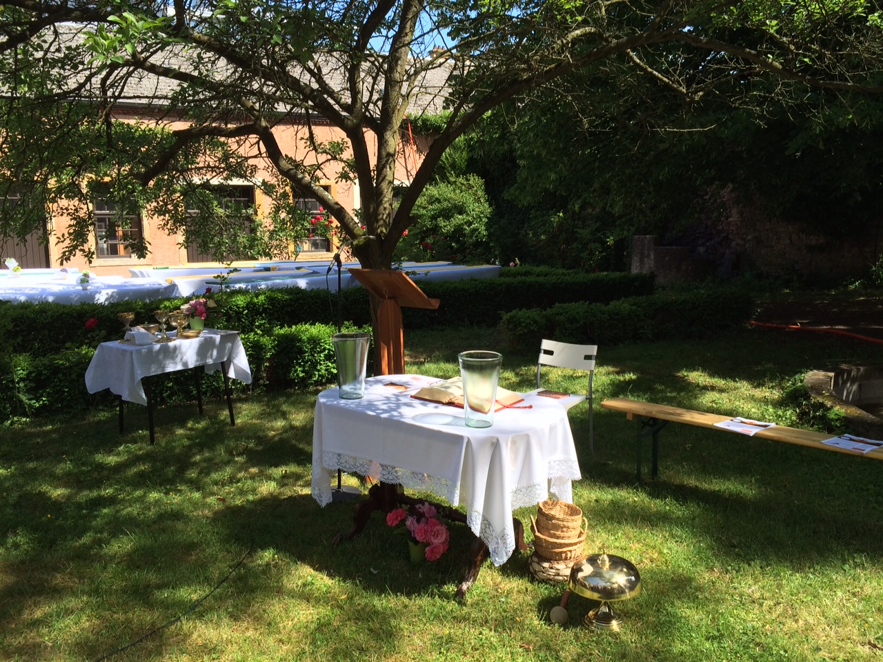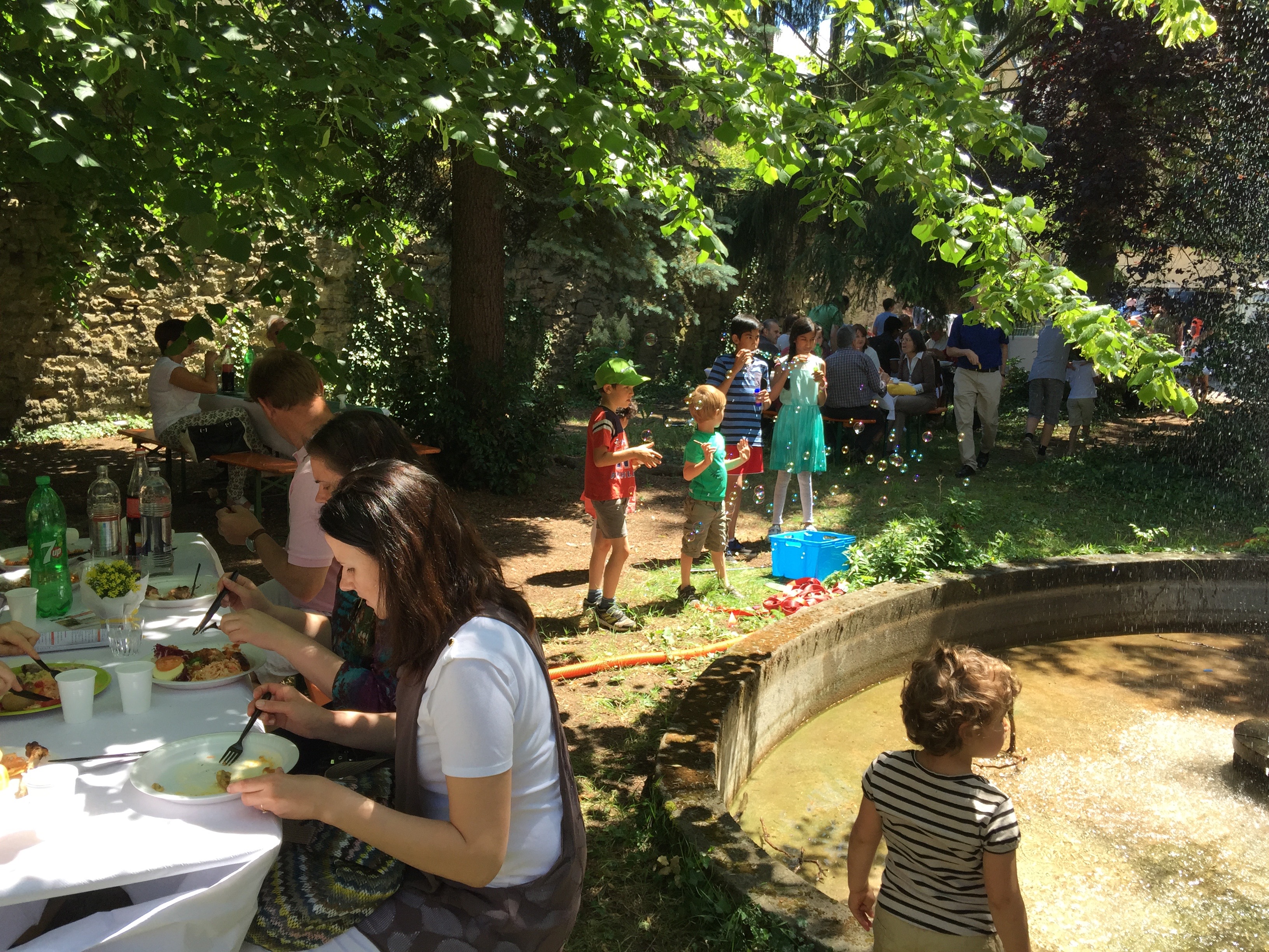 A hot, sunny day (which had defied earlier forecasts); a beautiful liturgy, enhanced by the environment and the sense of occasion; a superb BBQ, well organised, cooked and served; flowing crémant, beer, wine, soft drinks and water; a richesse of activities for children (of all ages); seeing a community working, worshipping and relaxing together; conversations between people who see each other every Sunday, but have never managed to chat before.