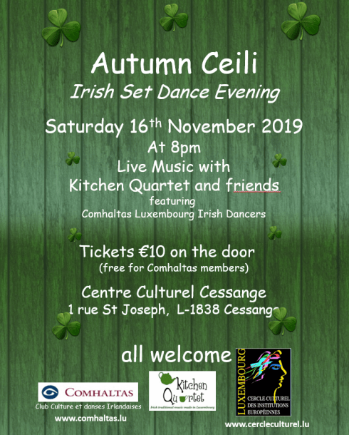 Comhaltas Luxembourg will be hosting an “Autumn Ceili” Irish Set Dance on Saturday 16th November at 8pm at the Centre Culturel Cessange.