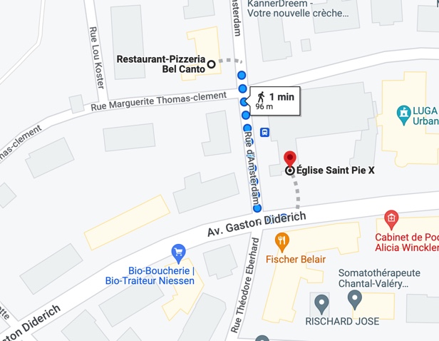 SUNDAY 11 AM MASS (PLEASE NOTE CHANGE OF TIME) : Eglise St Pië X, 112 Avenue Gaston Diderich, Belair L-1420. See map below for location.