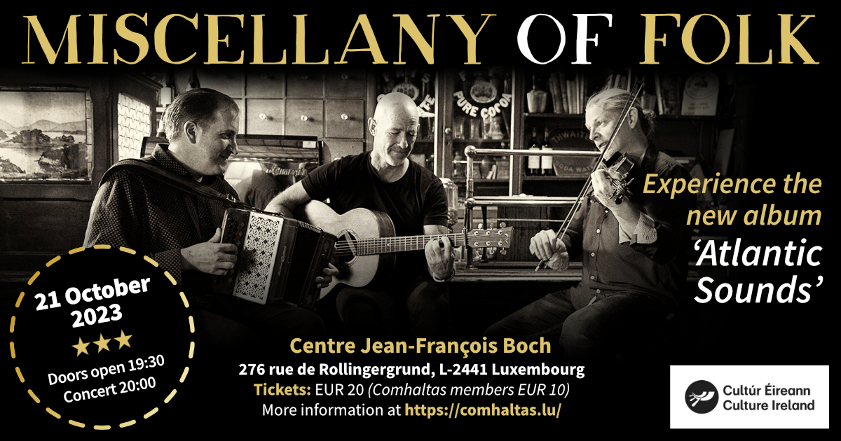 Comhaltas has informed us that a trad group, Miscellany of Folk, will be playing in Rollingergrund on Saturday 21 October . Tickets are EUR 20 (Comhaltas members EUR 10) and can be booked by mailing comhaltas.lu@gmail.com