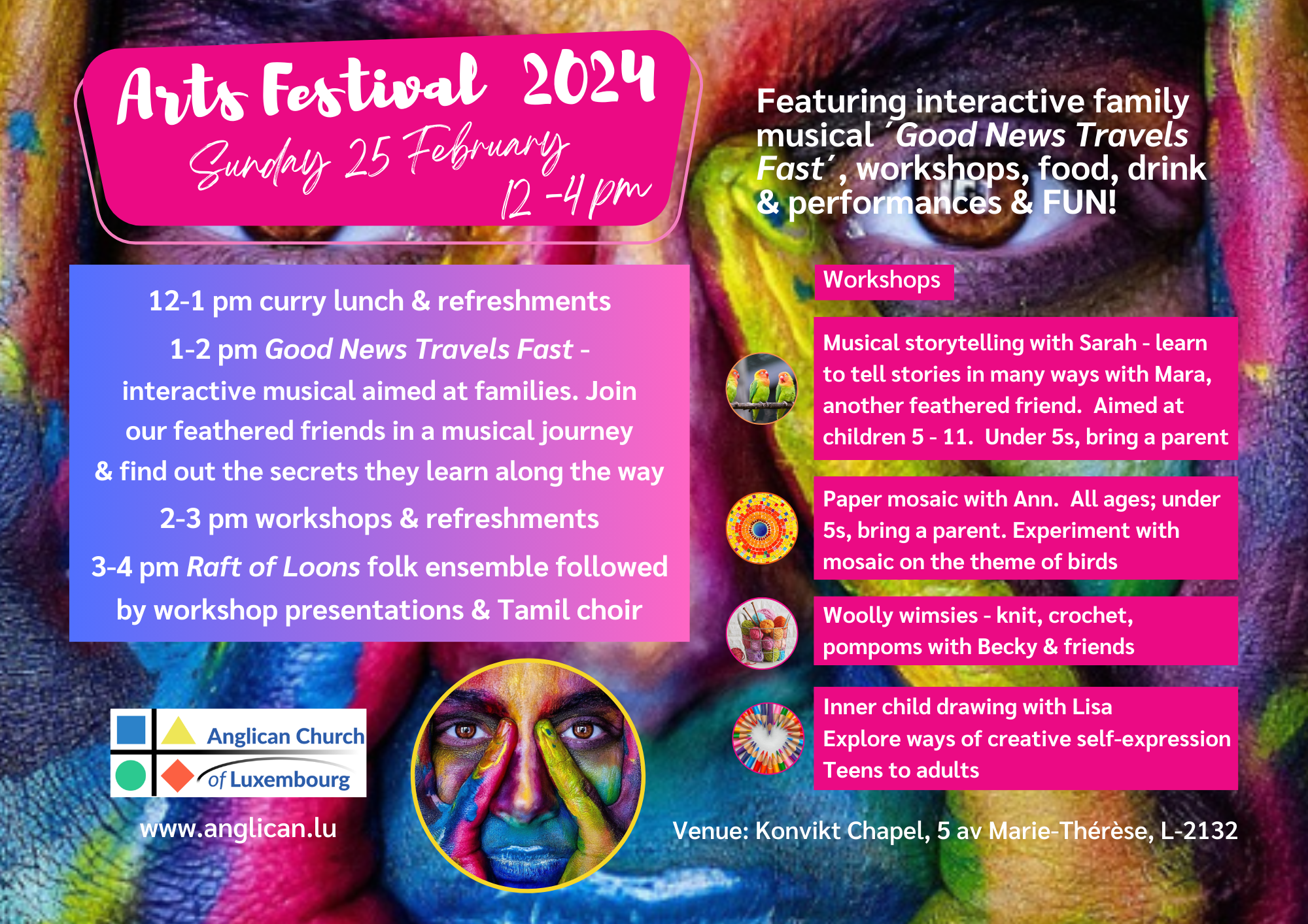 The Anglican Church of Luxembourg´s annual Arts Festival will take place on Sunday 25 February from 12:00 until 16:30 in the Konvikt Chapel at 5 ave Marie-Thérèse, L-2132.
